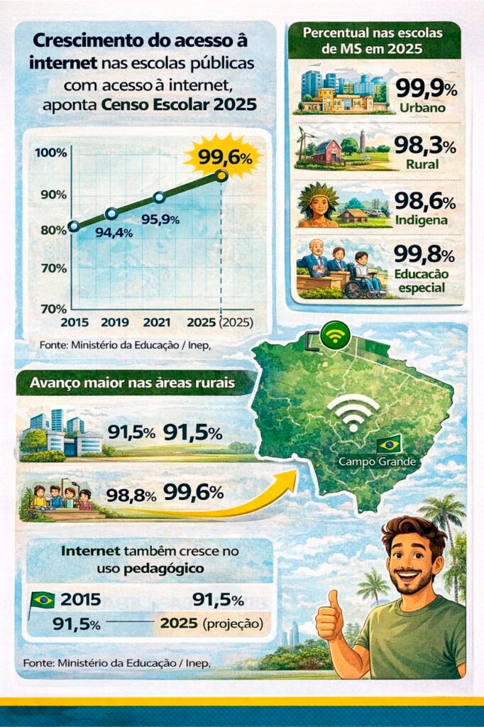 Mato Grosso do Sul está muito próximo de atingir a universalização do acesso à internet nas escolas públicas de educação básica. Dados divulgados pelo Censo Escolar 2025 mostram que 99,6% das instituições públicas de ensino infantil, fundamental e médio do estado já possuem acesso à internet.